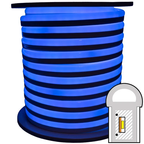 SMD LED blue neon rope lights are rolled in 148 foot spools and are cuttable every 19.5 inches. Custom cuts are also available for shorter lengths.
