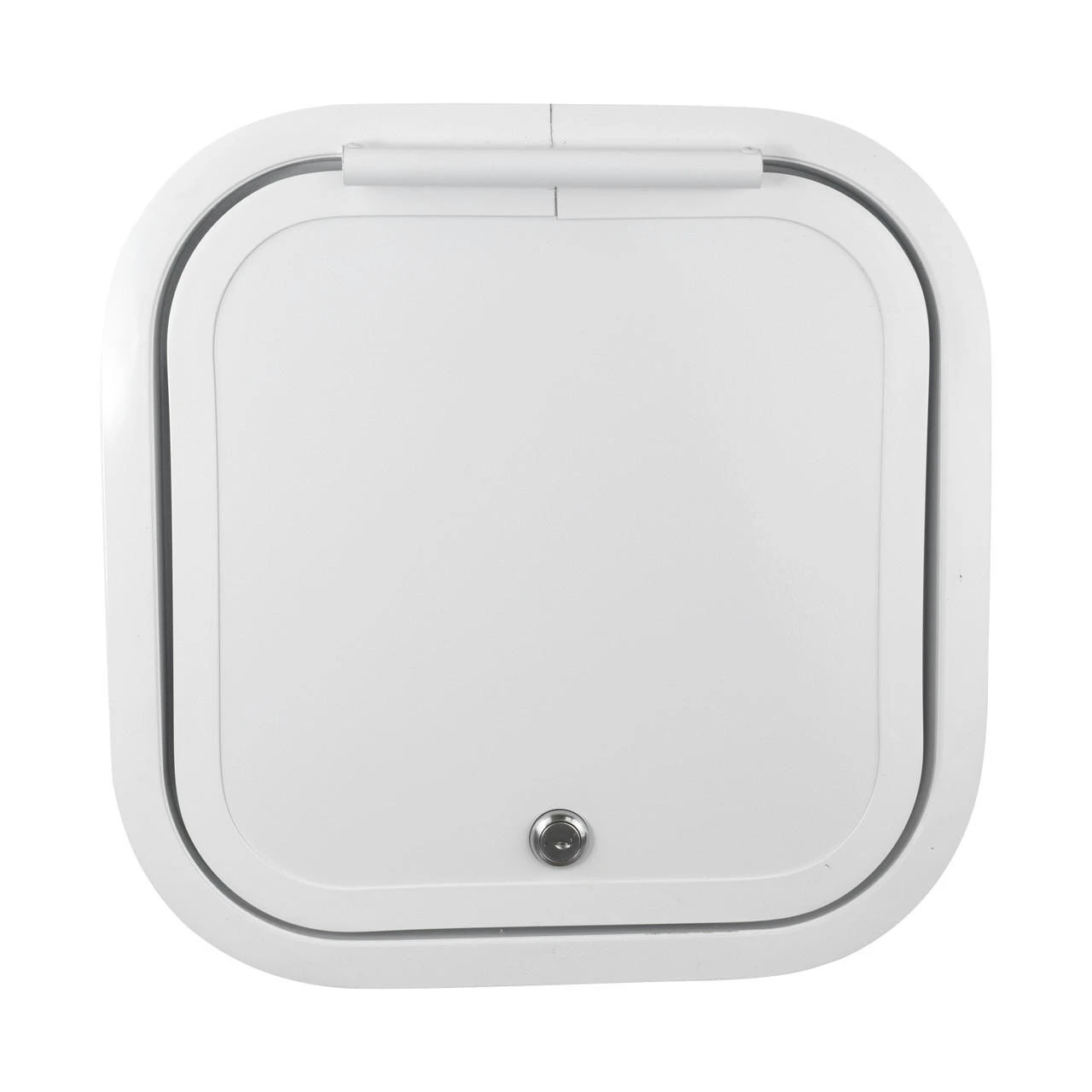 The door comes with a thumb lock and includes a key lock with key, maximizing your access options. It is constructed of smooth white fiberglass with a white aluminum frame.