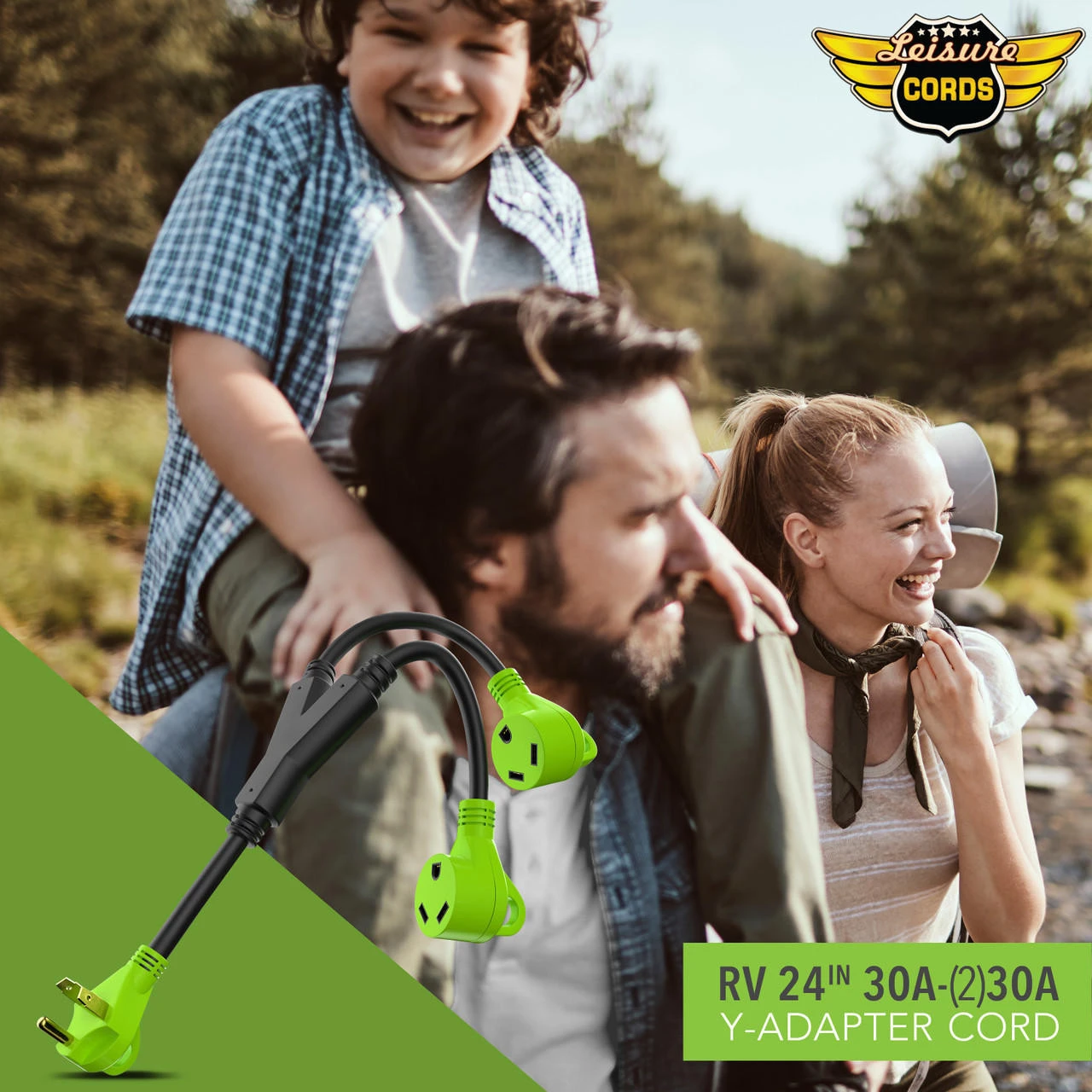 Splits your 30 Amp Male to Two 30 Amp Female Specifications -100% copper wire conductor inside -Heavy-duty power adapter cord for RV power inlet pedestal. -Recreational Vehicle addition one more socket use. -RV 30A male plug with handle. -RV 30A female plug *2EA with handle. -Using 10AWG*3 copper inner wire, support max 30 Amp overload. -Length : 24 inch plug to plug -When you have two RV 30A cords want to get power from a RV 30A power inlet, This cord set can help you do it.